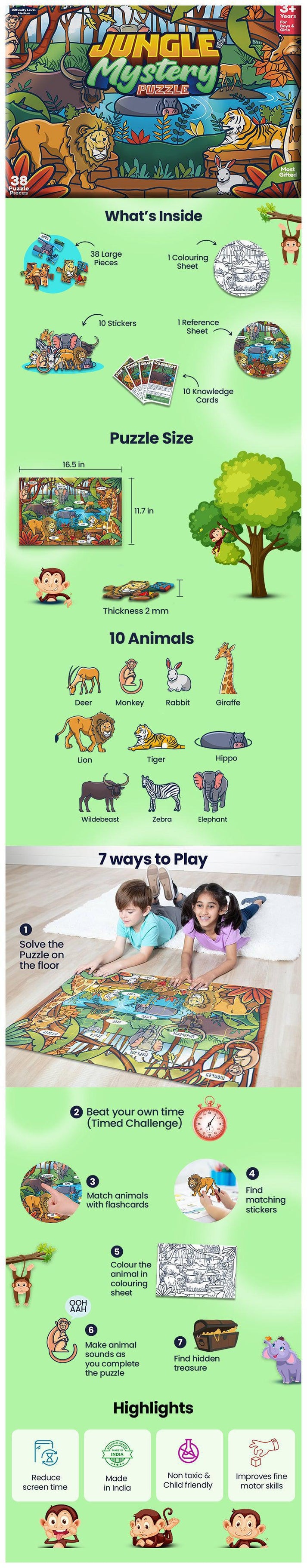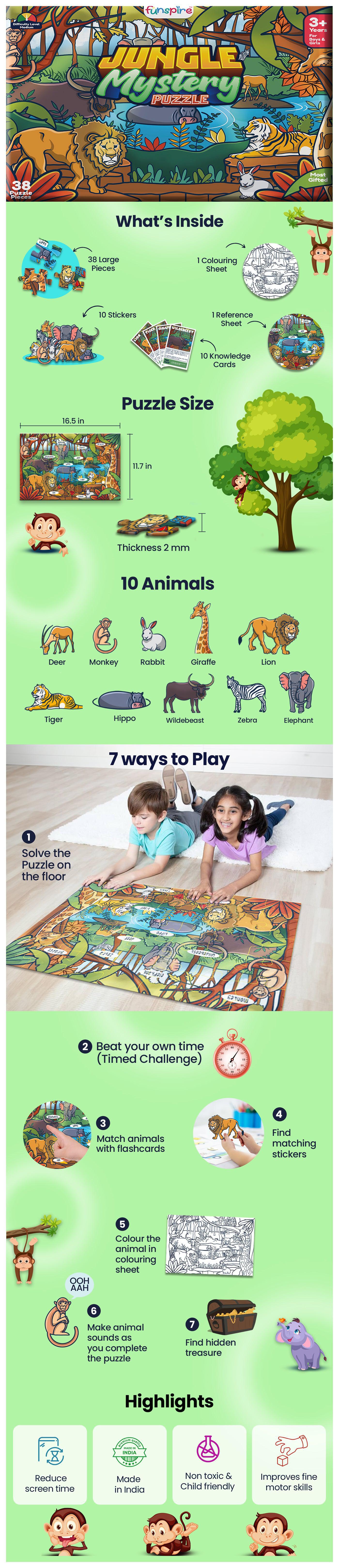 Embark on a wild adventure with this 38-piece jungle animals jigsaw puzzle designed for young explorers aged 3-8! This exciting puzzle features vibrant illustrations of ten beloved jungle animals, including lions, hippos, monkeys, wildebeests, rabbits, tigers, giraffes, zebras, elephants, and deer.
