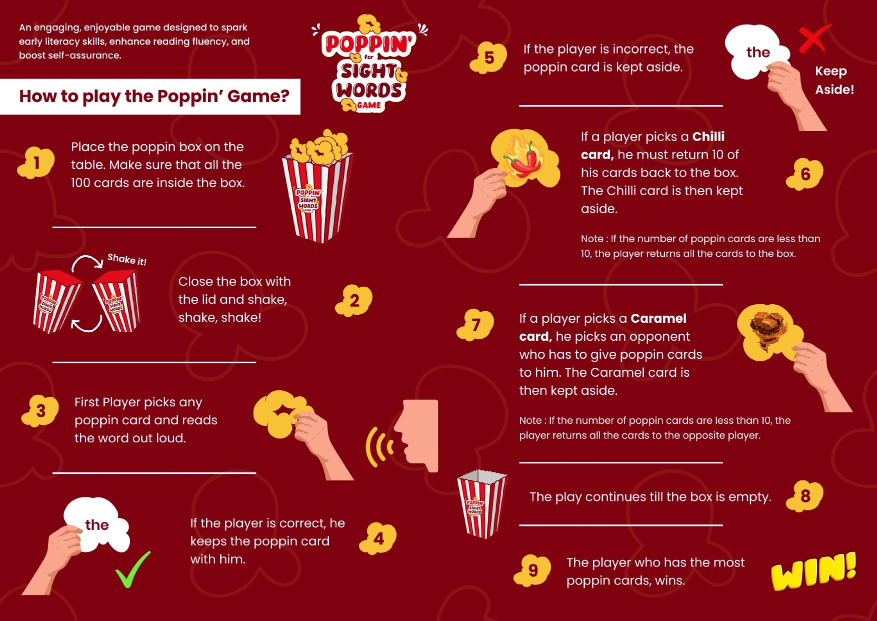 - Includes 100 popcorn-shaped cards: 92 sight words + 8 “POP!” cards that send your stash back to the box