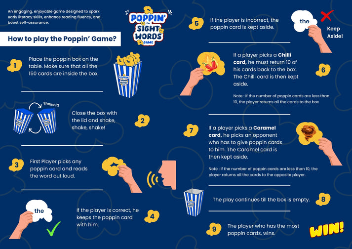 - Includes 150 popcorn-shaped cards: 142 sight words + 8 “POP!” cards that send your stash back to the box