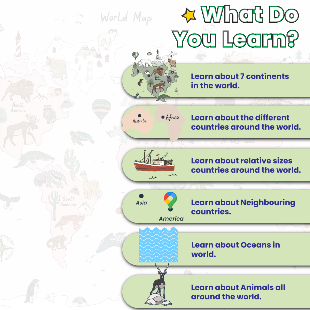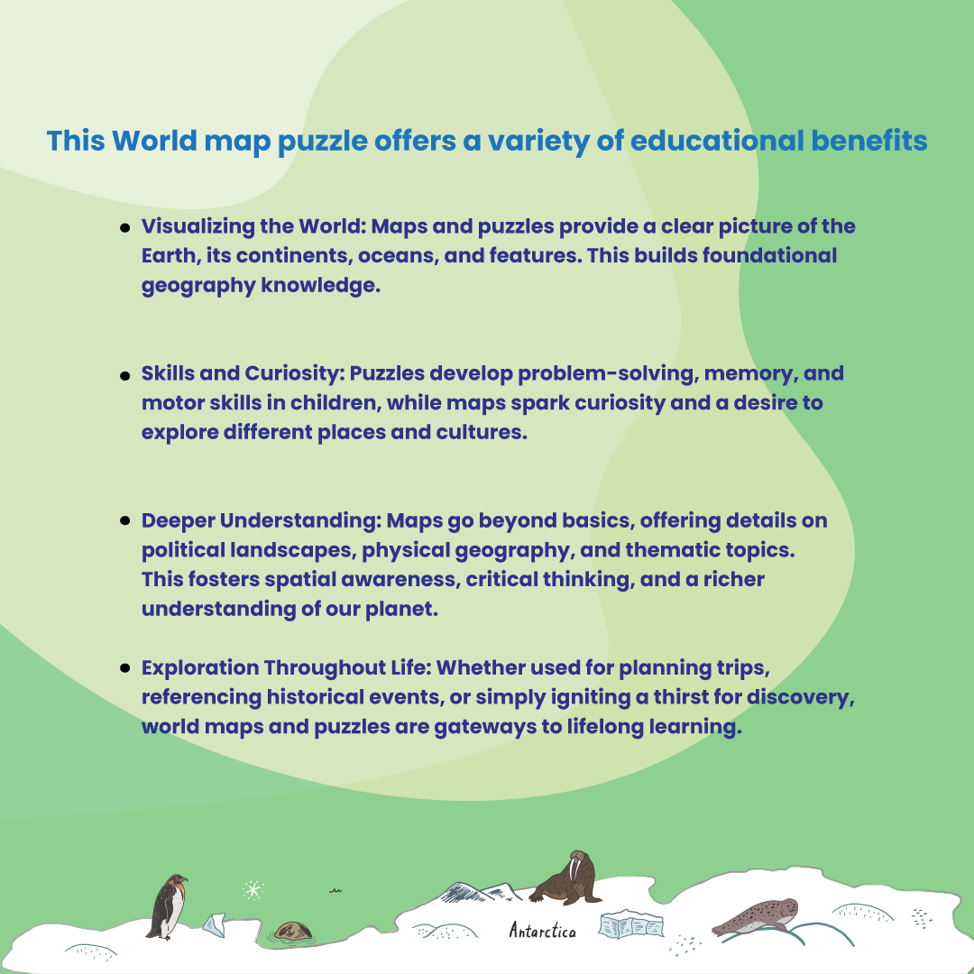 - World map can be overwhelming. This puzzle introduces children to the concept of exploration. Explain that the world is vast and diverse, encouraging their curiosity about different places, cultures, and environments.