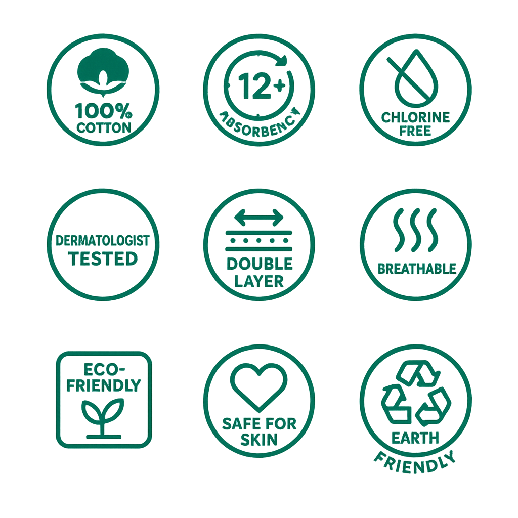 | Top Sheet (Liner) | 100% Cotton Nonwoven | Soft, breathable layer that directly touches the baby’s skin — no plastic |