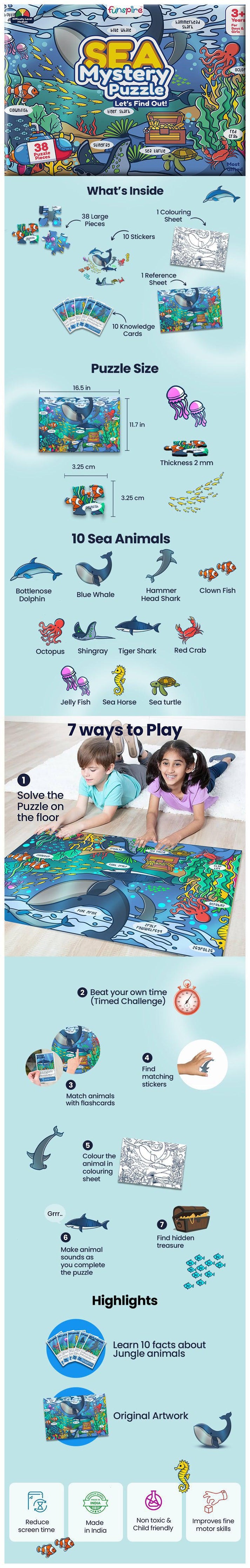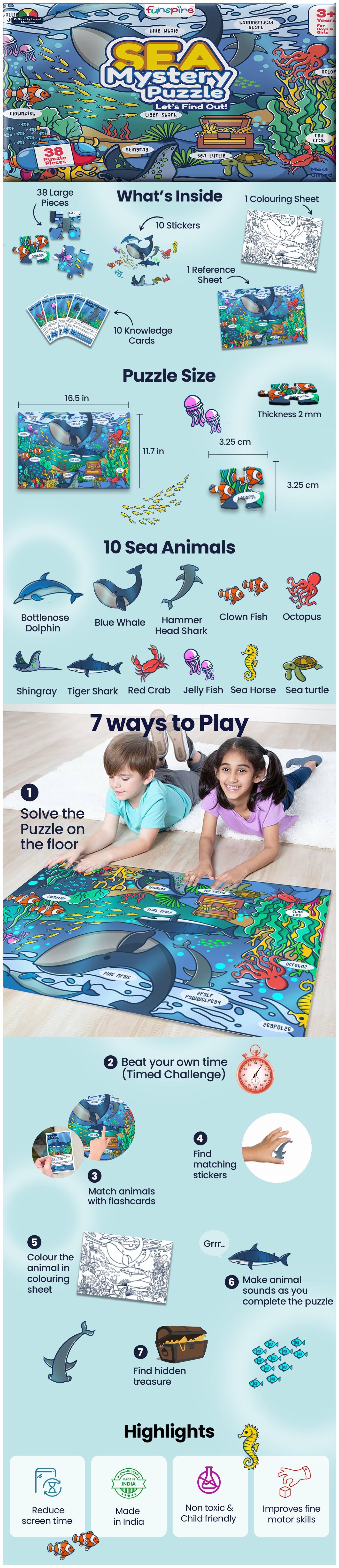 This 38-piece puzzle features vibrant illustrations of 10 fascinating sea creatures, including the majestic seahorse, the graceful stingray, the playful octopus, the daring hammerhead shark, the friendly bottlenose dolphin, the scurrying red crab, the mesmerizing jellyfish, the vibrant clownfish, the colossal blue whale, and the powerful tiger shark.