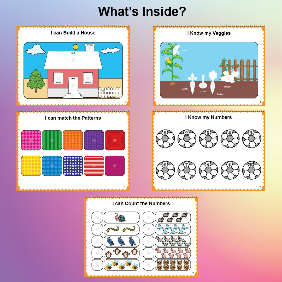 The binder includes 10+ interactive activities such as matching colors, identifying shapes, learning numbers, sorting patterns, and even building simple designs. Each activity is engaging and designed to be fun while teaching essential skills.